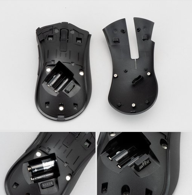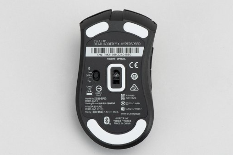 마우스 바닥면에는 4장의 폴리테트라 플루오로 에틸렌(PTFE) 제 마우스 솔이 붙어 있다. 중앙에 있는 센서 구멍을 사각으로 둘러싼 마우스 솔의 옆에는, 슬라이드 스위치가 있어, 이것으로 Razer Hyper Speed Wireless와 Bluetooth 접속의 어느 쪽을 사용하는가 하고 전원 오프를 바꾸는 구조다.