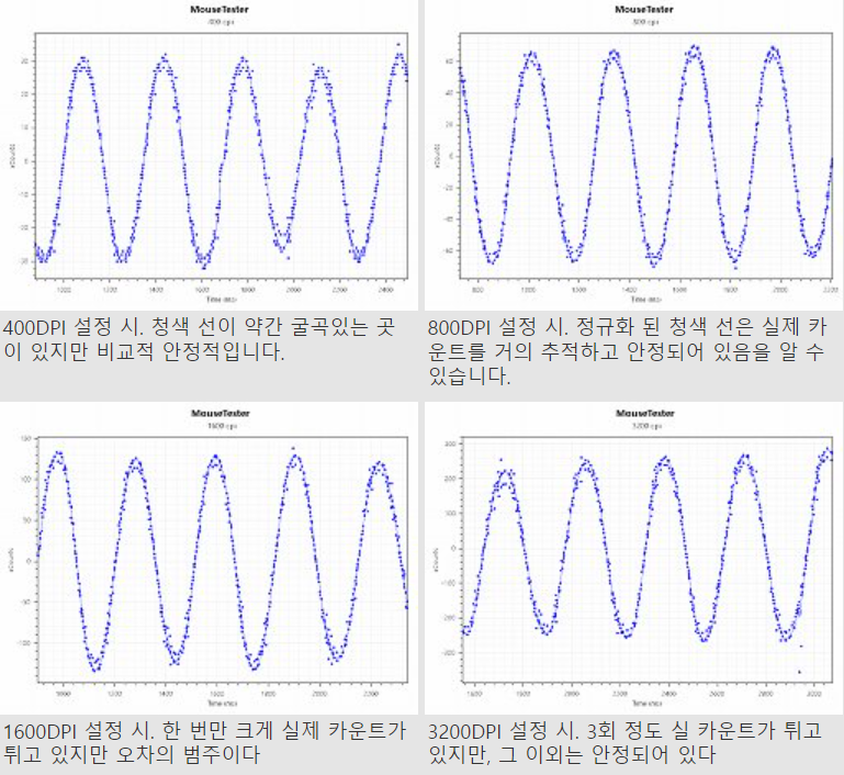 이 테스트에서는 마우스를 일정한 리듬으로 좌우로 흔들고, DPI를 400, 800, 1600, 3200으로 바꾸면서 계측했다. 그래프의 세로축의 플러스 방향이 왼쪽, 마이너스 방향이 오른쪽으로 흔드는 식으로, 가로축은 ms(밀리초)의 시간 경과를 나타내고 있다. 파란 점은 센서의 실제 카운트로, 파란 선은 그것을 정규화한 것이 된다. 푸른 선이 매끄럽고, 점 위에 줄지어 있을 정도로 양호한 성능이라는 것이다.