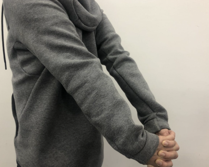 ② 견갑골이 움직이고 있는 것을 의식하면서 크게 숨을 들이마시면서 맞춘 손을 뒤로 뻗는다.