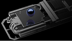 또, 중앙의 1기만 시계방향, 양단의 2기는 시계방향으로 회전의 방향이 다른 점도 독특하다. 동사에 의하면, (회전의) 방향을 바꾸는 것으로, 기류의 혼란을 억제해 냉각 성능의 향상을 실현하고 있다고 한다. GPU의 온도가 섭씨 50도를 밑돌면 팬 회전을 정지하는 기능도 갖췄다.