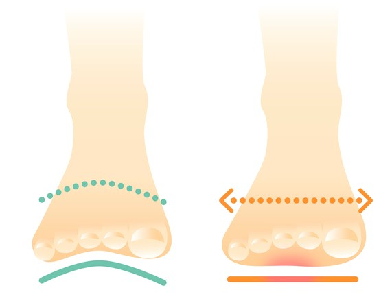 발바닥의 아치가 무너지고 평발이 되면 평소보다 가로 아치가 확대되고, 새끼발가락이 신발에 닿기 쉬워집니다. 따라서 새끼발가락이 신발 닳아 내반 소지를 일으킵니다.