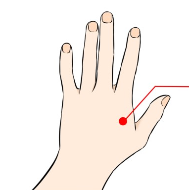 경혈을 눌러 자극함으로써 치아의 통증이 완화되는 경우가 있습니다. 화상에 있는 것이 "합곡"이라는 혈로, 뇌가 느끼는 통증을 완화해 주는 작용이 있다고 알려져 있습니다.
