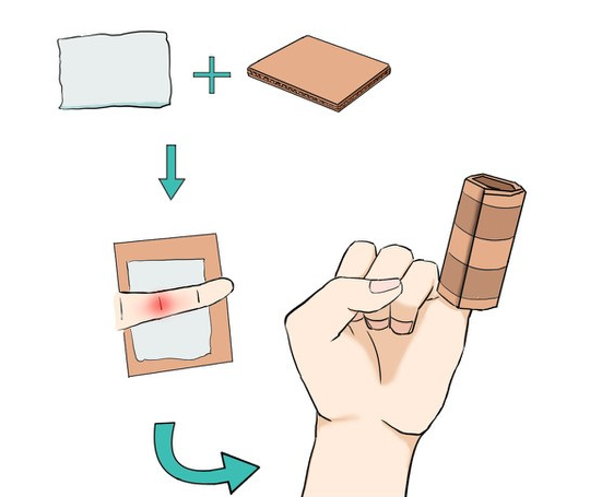 - 새끼손가락에 수건을 감고 그 위에 골판지를 두른다
