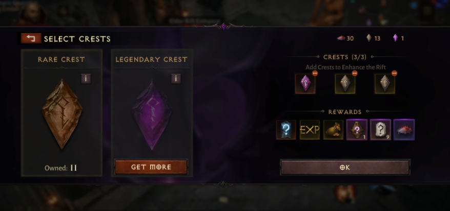 덧붙여서, 엘더 리프트에 입장할 때 "Crests"라는 아이템을 바쳐두면 레어 아이템 등의 드랍률이 상승하는 구조로 되어있다."Crests"는 청구 콘테츠의 하나이기도 하지만 이번 플레이 한 바로는 Crests 없이도 전설 등은 일반적으로 드롭하기 때문에, 어디 까지나 하나의 노동 시간 단축 생각 좋을 것이다.