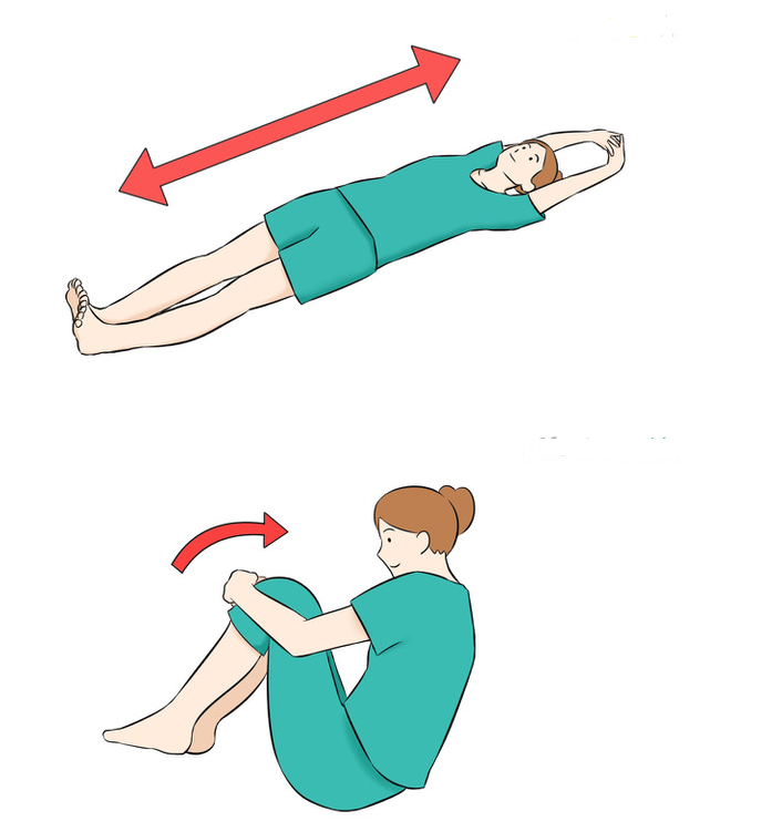 - 위로 향해 누워 양손을 끼고 손바닥이 밖을 위로 힘껏 뻗어 있습니다. 이때 다리도 아래로 힘껏 뻗어 기지개를 하십시오.