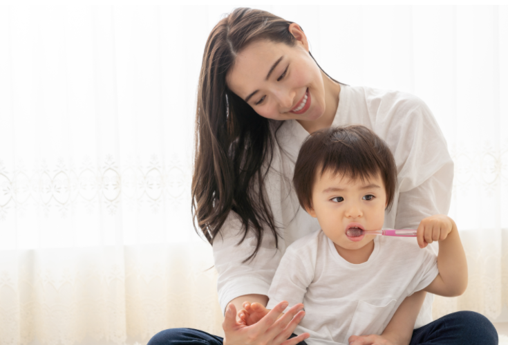 치아가 자라면 사용해 봅시다. 월령에 따라서는 싫어하기 때문에 치아가 나기 시작할 무렵부터 입안에 브러시를 넣는 연습을 해 둡시다. 칫솔은 입안에 넣어도 위험하지 않은 손잡이 의 것 (길이 불과 가늘지 않은 경우) 부드러운 머리카락 의 것을 선택합시다. 아기가 갖고 싶었을 때에도 위험하지 않은, 무늬가 둥글고 있는 것도 있습니다.
