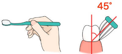 2. 칫솔을 45° 각도로 치아와 잇몸의 경계에 댄다