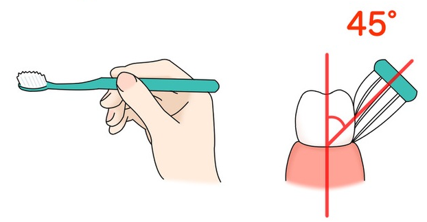 2. 치아와 잇몸 사이에 칫솔모가 들어가도록 칫솔을 치아에 45도 각도로 댄다.