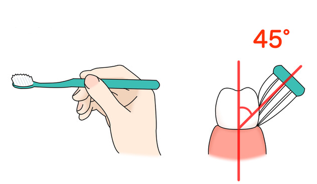 2. 치아와 잇몸 사이에 브러시 머리카락이 들어가도록 칫솔을 치아에 대해 45도 각도로 맞추십시오.
