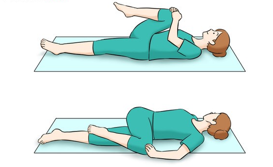 2. 한쪽 다리를 90 도로 구부리고 반대 방향으로 돌린다. (왼발을 구부린 경우 오른쪽으로 돌린다)
