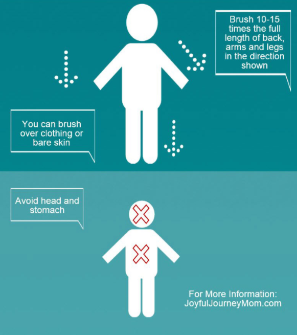 치료 압박 프로그램은 감통 솔(월 버거 브러시)을 통하여 아이에 고유 수용선 감각을 일정하게 자주 제공하여 감각 방어를 감소시키거나 없애는데 매우 효과적이라고 설명받았다.