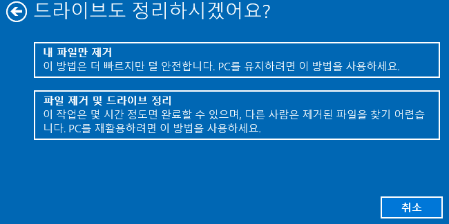 * 하드 드라이브가 여러개의 경우 추가적인 선택창이 나오며 Windows 설치 드라이브만 제거 & 모든 드라이브