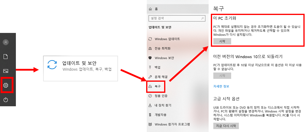 1. 시작 메뉴의 톱니 바퀴 클릭 (설정 진입) -> 업데이트 보안 메뉴 진입 -> 복구탭 -> 이 PC 초기화 시작 클릭