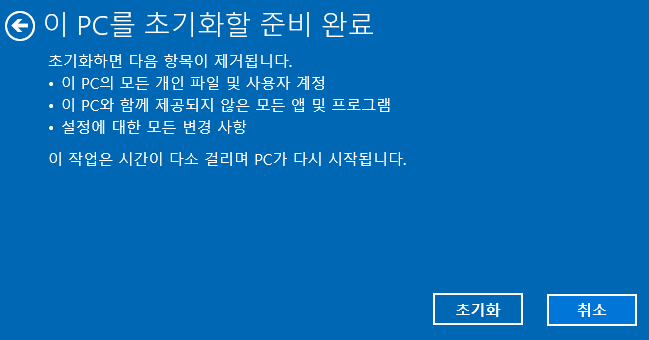 5. 재부팅 후 초기화를 진행 합니다. 이때 소요되는 시간은 PC간 전부 다르며 최대 60분까지 소요 됩니다.