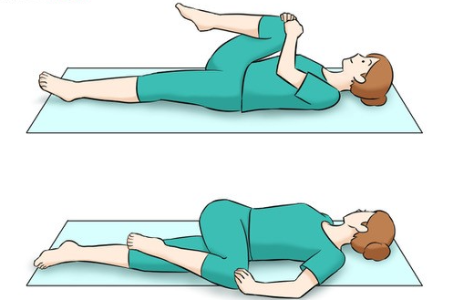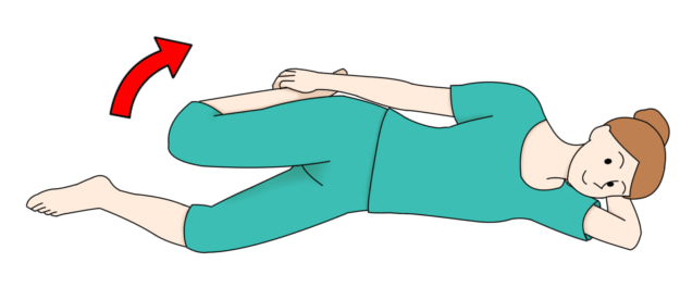 3. 안고 있는 쪽의 다리를 뻗고 있는 다리 방향으로 눕히고 엉덩이의 근육을 늘린다.