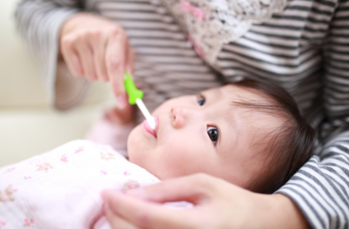 유아의 경우 잇몸에 우유 찌꺼기 같은 하얀 부드러운 것이 붙어 있습니다.