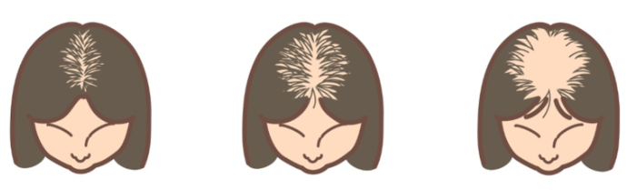 여성의 장년성 탈모증에서는 Ludwig 루트비히 분류라고 불리는 분류 방법을 이용하여 얇은 머리의 진행 정도를 3단계로 분류합니다. I형이 가장 경도이며, II, III로 진행됨에 따라 얇은 머리의 범위가 넓어져 모량이 줄어듭니다.