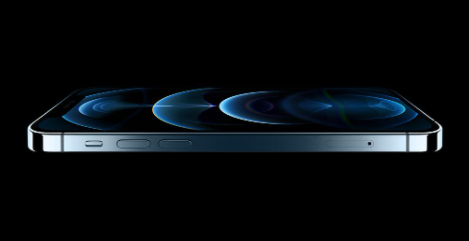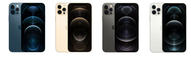 iPhone 12 Pro와 iPhone 12 Pro Max는 골드, 흑연그래파이트 (작년까지의 공간 그레이), 실버 플러스 자정 그린 바뀌어 퍼시픽 블루가 동참. 총 4 색 전개이다. 뒷면은 촉촉한 질감의 해체 유리 같은 질감 측면은 윤이 금속 자체. 두 개의 서로 다른 질감은 고급 대비를 만들어 내고있다.