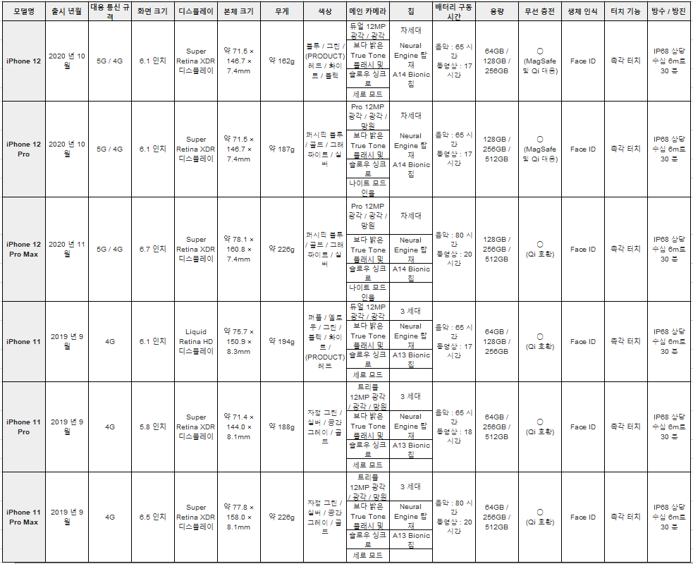 또한 iPhone 12 시리즈의 디스플레이는 iPhone 11 Pro와 iPhone 11 Pro Max에 탑재 된 Super Retina XDR 디스플레이를 채용하여 더욱 고화질 렌더링 및 에너지 효율 향상을 실현하고있다.