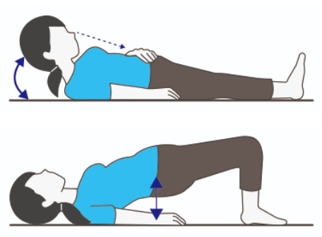 ① 위를 보고 누워 양 무릎을 세우고 배에 힘을 주며 허리를 최대한 높이 들어 올린다