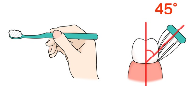- 치아와 잇몸의 경계는 칫솔을 45° 각도로 대고 닦아줍니다.