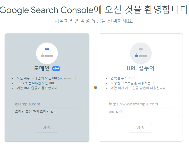 먼저 Google Search Console에 접속하여 자신에게 맞는 곳에 블로그 주소를 기입합니다.