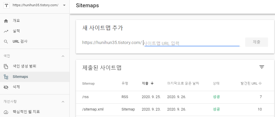 적용 후 확인을 누르면 소유권이 확인되며 네이버와 동일하게 사이트맵 등록, RSS 등록을 해줍니다.
