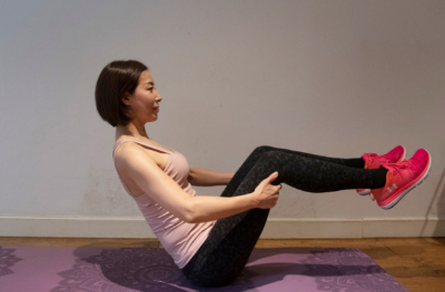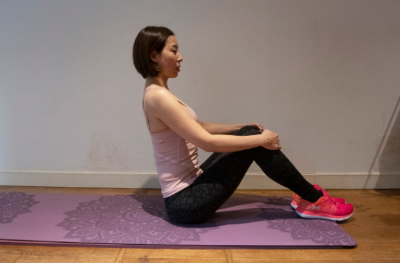 2. 숨을 들이마시고 준비하고 숨을 내쉬면서 등뼈를 꼿꼿이 세운 채 뒤로 넘어지고 오른발, 왼발을 차례로 들어 올립니다.