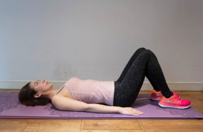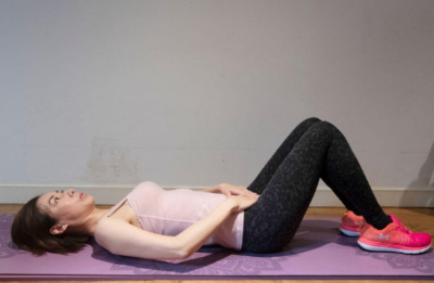 1. 위를 보고 누워 양 무릎을 세우고 골반 위에 양손을 올려 삼각형을 만듭니다.