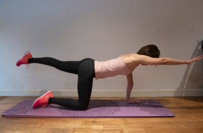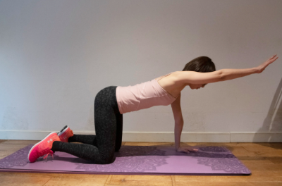 6. 숨을 들이마시면서 오른손과 왼발을 천천히 되돌린 뒤 이번엔 숨을 내쉬며 왼손과 오른발을 들어 3초 유지.