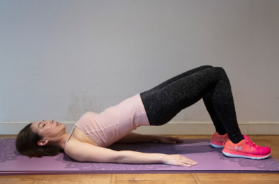 2. 숨을 들이마시고 준비하고 내쉬면서 허리 뒤 틈새가 없도록 골반을 뒤로 젖힙니다. 엉덩이에서 서서히 몸을 천장을 향해 들어 올려 무릎에서 어깨가 일직선이 되도록 합니다. 허벅지가 열리지 않도록 조심합시다. 엉덩이는 가능한 한 콤팩트하게 중심에 대도록 합니다.
