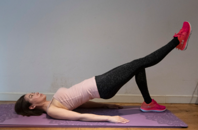 3. 그 자세를 유지한 채 숨을 들이마시고 준비, 내쉬면서 오른발을 왼쪽 무릎 높이까지 천천히 올려줍니다. 이때 엉덩이가 처지거나 골반이 움직이지 않도록 주의를 하도록 합시다. 왼발도 똑같이 할게요