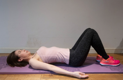 1. 위를 보고 누워 양 무릎을 세우고 골반 위에 양손을 올려 삼각형을 만듭니다.