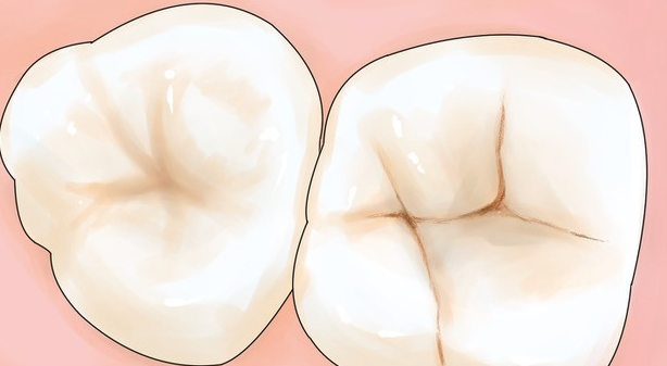 왼쪽의 치아는 아직 초기 단계에 오목한 부분에 충치가 자라고 있고 색소가 붙기 쉽게 되어 있습니다. 오른쪽 치아 홈을 따라 충치가 진행되고 있는 단계에서 갈색 · 거뭇 해지고 있습니다.