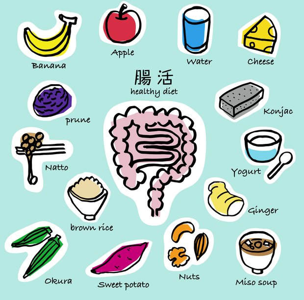 해조류, 비지, 낫토, 감귤류, 우엉, 셀러리, 아스파라거스, 양배추, 고구마, 곤약, 현미, 버섯, 말린 과일, 오트밀