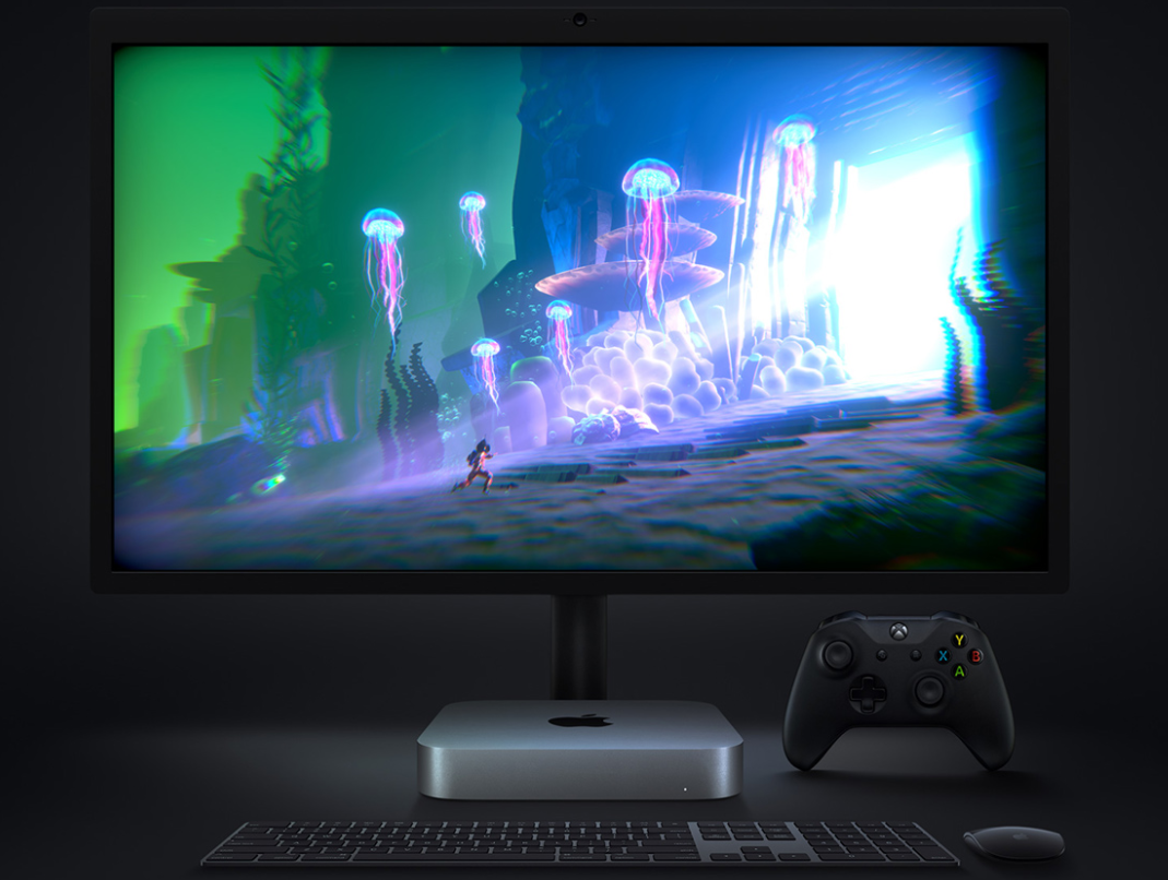 게임 패드와 함께 게임을 플레이하는 이미지 사진도 공개되어 있으며, 거치형 게임기으로 Mac mini를 사용하는 것을 Apple은 상정하고있는 것 같다.