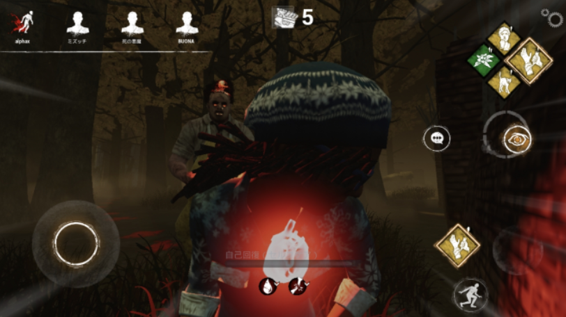 한편 「Dead by Daylight Mobile」에서는 심음의 연출이, 서바이버의 몸에 심장의 아이콘이 떠오른다고 하는 것으로 변경되고 있어 킬러의 접근을 시각적으로 알 수 있게 되어 있다. 킬러에 가까울수록 심장의 아이콘이 밝아지므로, 이것에 의해서 대략의 거리감을 잡을 수 있을 것이다. 심장이 밝아지는 방향으로부터 멀어진다고 하는 탐지기와 같은 사용법도 할 수 있기 때문에, 게임에 익숙하지 않은 사람이나, 주위에 소리를 낼 수 없는 환경에서 놀고 있는 사람에게 있어서는 꽤 고마운 사양이라고 말할 수 있다.