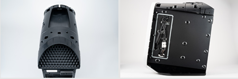 배면측을 보면, 둥그스름한 상부와 벌집 구조의 배기구 멍이 눈에 띈다.