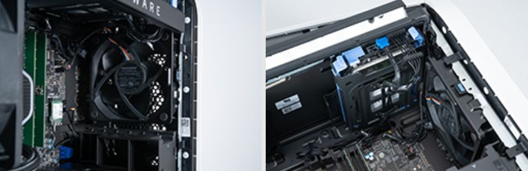 그런데, 케이스 내부를 세세하게 보면, 흡기용으로서 전면에 2기의 120㎜ 직경 팬을 장착하고 있는 것을 알 수 있다.게다가 상판 측과 배면 측의 라디에이터에는 배기용의 120 mm경 팬이 1기씩 있다. 이것에 전원 유닛의 팬을 조합하는 것으로, 전면으로부터 배면 및 상판으로 빠지는, 꽤 제대로 된 에어 플로우가 확립되어 있는 것이다. 실제, New Alienware Aurora R13은 에어 플로우를 상당히 고집하고 있는 것 같고, 메인보드까지 에어 플로우에 맞추어 개발했다고 한다.