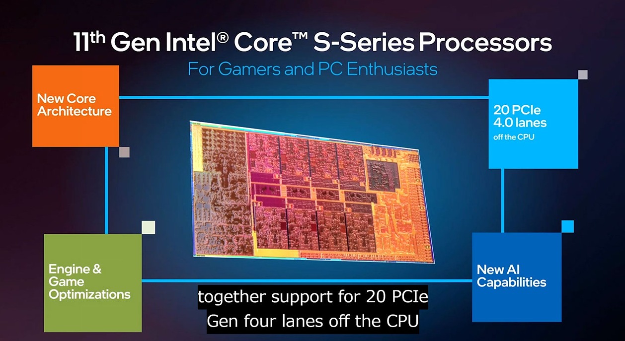 Rocket Lake-S는 "Cypress Cove"라는 아키텍처를 채용하는 14nm 프로세스 세대의 CPU에서 X e Graphics 기반의 내장 GPU를 갖추고 있어 Intel의 데스크톱 PC 용 CPU로는 처음으로 최대 20 레인 PCIe 4.0에 대응한다.