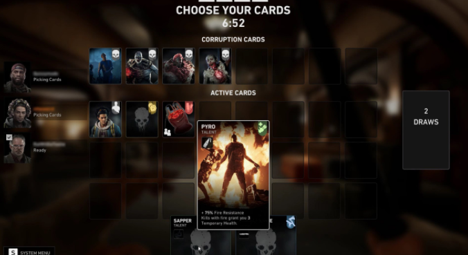카드시스템은 좀비 측과 플레이어 측의 쌍방에 걸쳐 기능, 게임이 시작되면 먼저 게임 디렉터가 "커럽션 카드"를 당기고 등장하는 적의 종류와 단계의 설정이 바뀐다. 그러면 더 큰 무리의 습격이 일어난다거나, 안개가 끼어 전망이 나빠질 탄의 회수가 어려워지는 등 수 일어날 수 있다.
