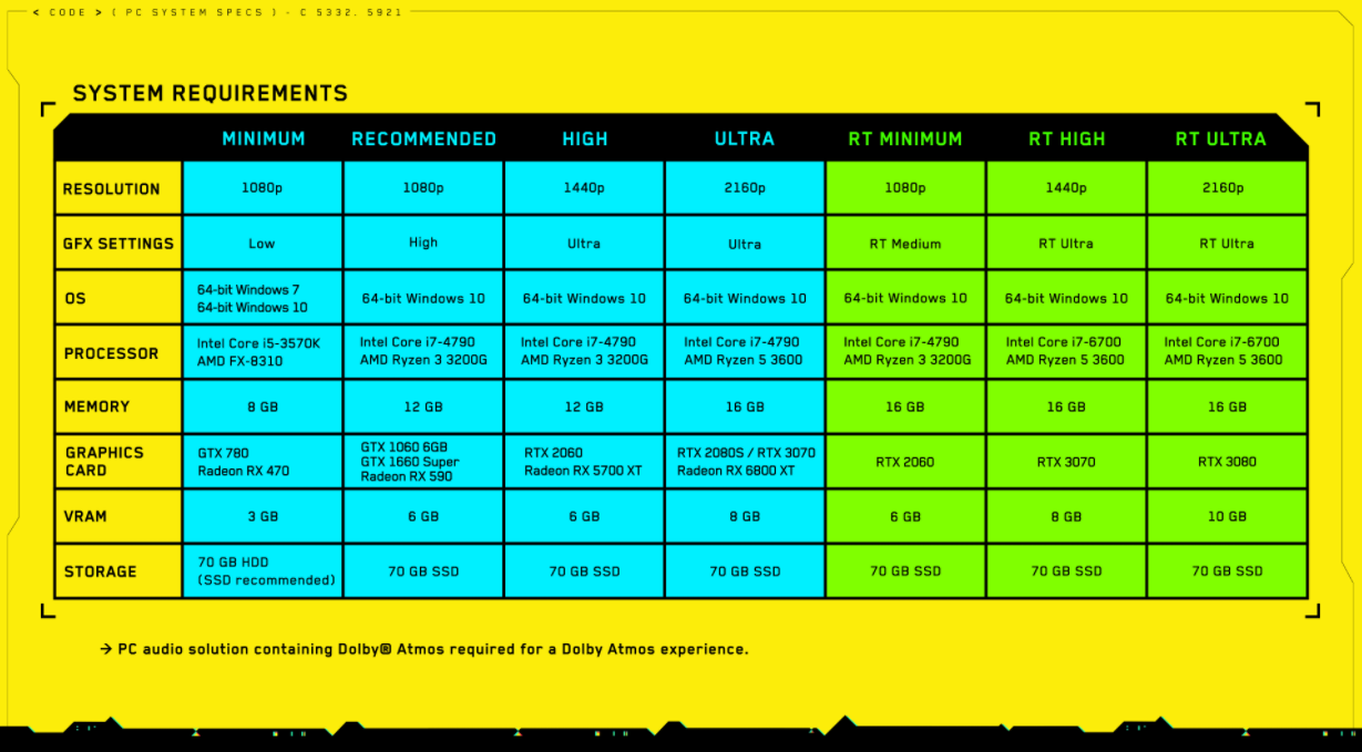 CD PROJEKT RED는 2020 년 12 월 10 일에 발매를 예정하고있는 오픈 월드 RPG '사이버 펑크 2077' ( PC / PS5 / Xbox X,S )의 PC 버전의 필요 스펙 을 공식 Twitter 에서 공개했다 .