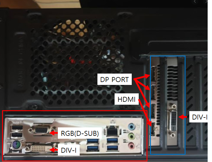 3번의 위 사진처럼 메인보드에 VGA 기능이 있는 상태에서 VGA CARD가 장착된 상태라면 VGA CARD를 제거하고 빨간 테두리의 메인보드쪽에 모니터 케이블을 연결하여 출력이 나오는지를 체크한다.