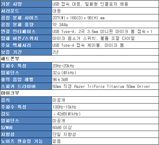 Razer 제품답게 정원에 가까운 이어캡(=인클로저)은 실측으로 90(W)×100(D)×32(H)㎜(이어패드 제외) 정도의 사이즈가 있으며, 최근의 제품 중에서는 조금 큰 부류일 것이다. 실측 중량은 마이크 붐과 케이블을 제외하고 약 333g. 마이크 붐은 팝 노이즈 필터 포함으로 실측 약 10g이므로, 합해 약 343g이 된다.