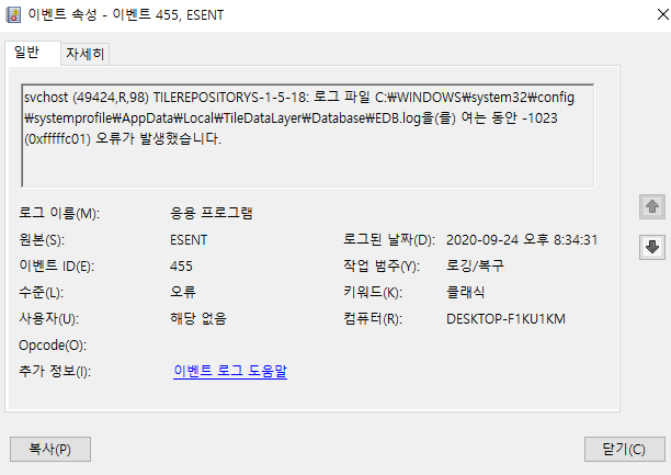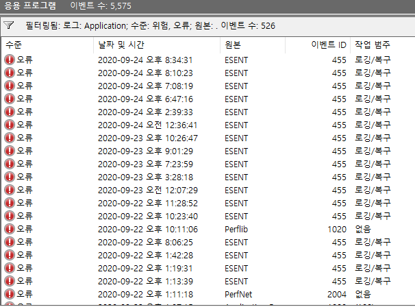 오류가 많이 발생했다고 쫄지 마세요 왜냐 저런 오류가 발생되고 있어도 현재 저는 이렇게 문제없이 윈도우를 사용 중이니깐요. 그렇다면 왜 굳이 이 로그를 봐야 하는가? 실제 블루스크린이나 프로그램상 오류가 발생되었을 경우 저 이벤트 로그에 기록됩니다. 그럼 오류코드와 오류 원인 파일을 알 수 있습니다. 예로 위 이미지에서 가장 많이 일어나고 있는 오류 ESENT를 봅시다.