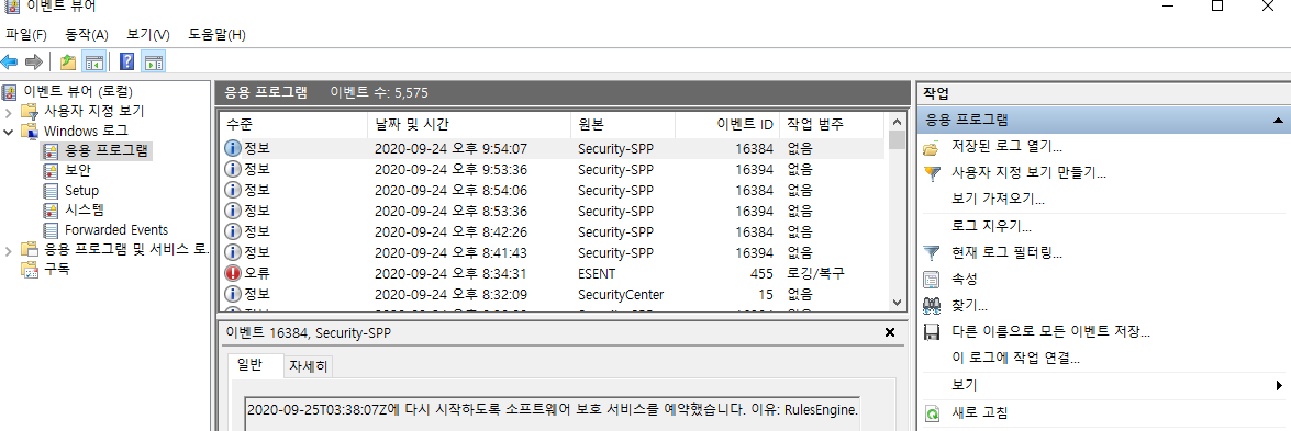 먼저 응용프로그램 탭을 살펴보면 말 그대로 윈도우가 움직이는 모든 행위들을 기록합니다.