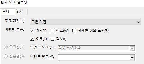 좌측 탭 메뉴의 현재 로그 필터링을 눌러 위험, 경고만 체크 후 검색을 해줍니다