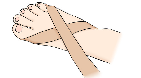 2 개의 테이프가 발등의 크로스 하도록 테이핑을 보자. (위의 그림 참조)